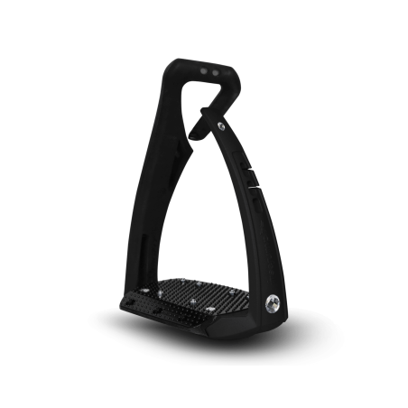 The outer branch of the stirrup is made of Elastollan®, a flexible material that deforms and allows the branch to open, facilitating foot release in case of a fall.
